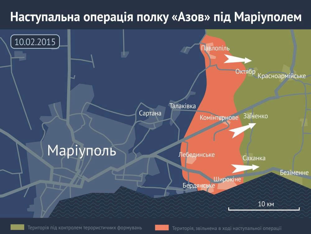 Саме на світанку 10 лютого 2015 року «Азов» пішов у наступ, а вже о дев’ятій ранку азовці взяли перший блокпост в напрямку Саханки. Тоді противник почав відступати, було звільнено Павлопіль та розпочався штурм Октябра. Цього ж дня наші бійці вже повністю контролювали Широкине, хоча бої там тривали і супроводжувалися високою щільністю вогню з обох боків. Ворог бив з бронетехніки, а російська авіація тричі перелітала кордон, однак удару по наших силах не завдавала.