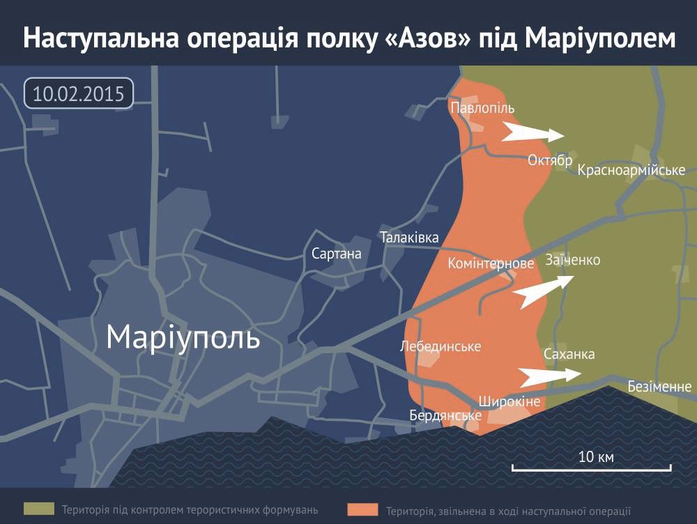 На момент початку наступу 10 лютого в «Азові» все йшло за планом: до 10-ї ранку підрозділ зайняв ключові позиції. У Павлопіль заходили перша рота полку «Азов» під командуванням Редіса та азовська розвідка. Вони мали отримати підтримку у вигляді трьох танків Збройних сил України, проте в останні години перед наступом техніку давати відмовилися. Коли азовці заходили у Павлопіль, розпочалася досить серйозна сутичка – з ворожими танками, з артилерією, але селище все-таки зачистили та успішно укріпилися в ньому. Фактично за тією ж схемою відбувалось зайняття позицій в інших населених пунктах, а саме: третя рота під командуванням Гала тоді зайшла у Комінтернове, а друга під командуванням Кірта – у Широкине. У Комінтерновому азовці підняли синьо-жовтий прапор. Хлопці і нині згадують, що місцеві мешканці чекали на визволення українськими військами, було видно, що вони хотіли захисту.
