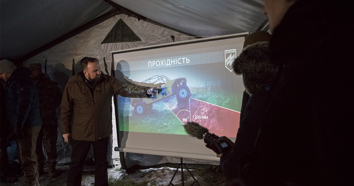 Напередодні, 8 грудня, на навчальному полігоні НГУ під Києвом презентували багатофункціональний армійський «Багі» — азовський прототип. Це унікальна розробка добровольчого полку “Азов” та української інженерної команди, ідея якої належить Андрію Білецькому.