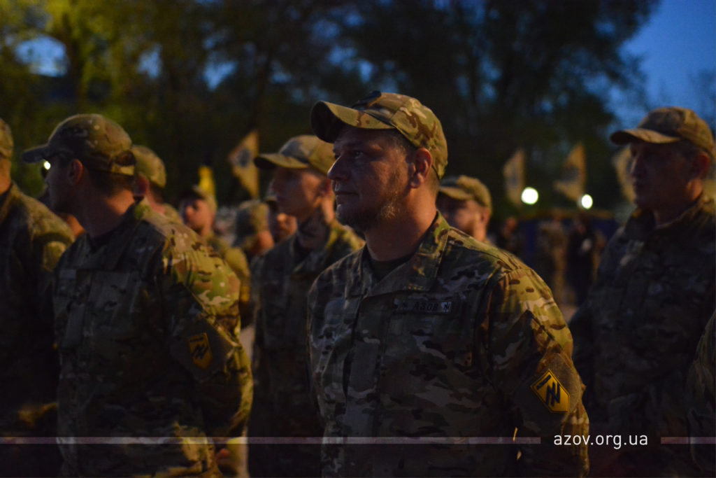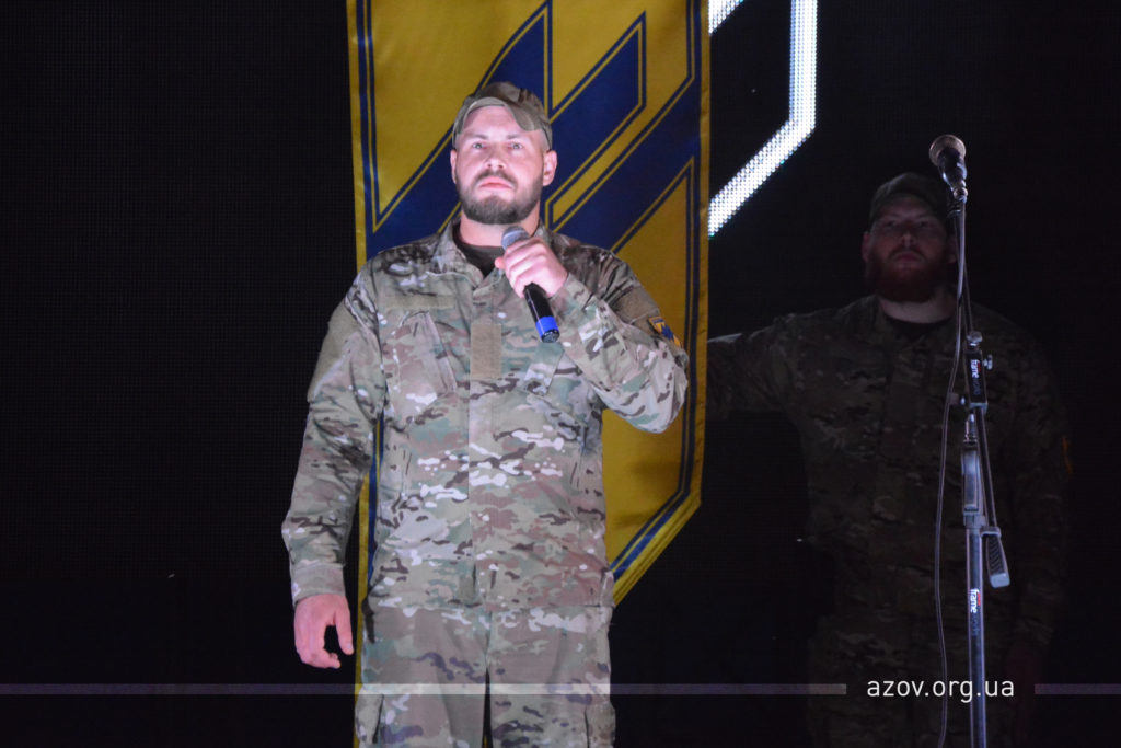«В 14 році «Чорний корпус» приїхав на Донбас, який палав в неоголошеній війні проти нашої держави. «Чорний корпус» дійсно був погано забезпечений і все, що вони мали, давалось українським народом, волонтерами. 5 травня тут, в цих степах на Приазов’ї, ми отримали офіційний підрозділ, ми отримали зброю та можливість з честю захищати українську землю і знищувати ворога. Сьогодні війна за 100 кілометрів звідси. Ми її там зупинили. Я впевнений, найближчим часом ми зможемо відсунути кордон розмежування до реального кордону України. Це наша заповітна мрія. Зараз полк «Азов» перебуває на лінії розмежування і проводить свою роботу. Дякую вам, побратими, за велич нашого підрозділу. Слава нації!»