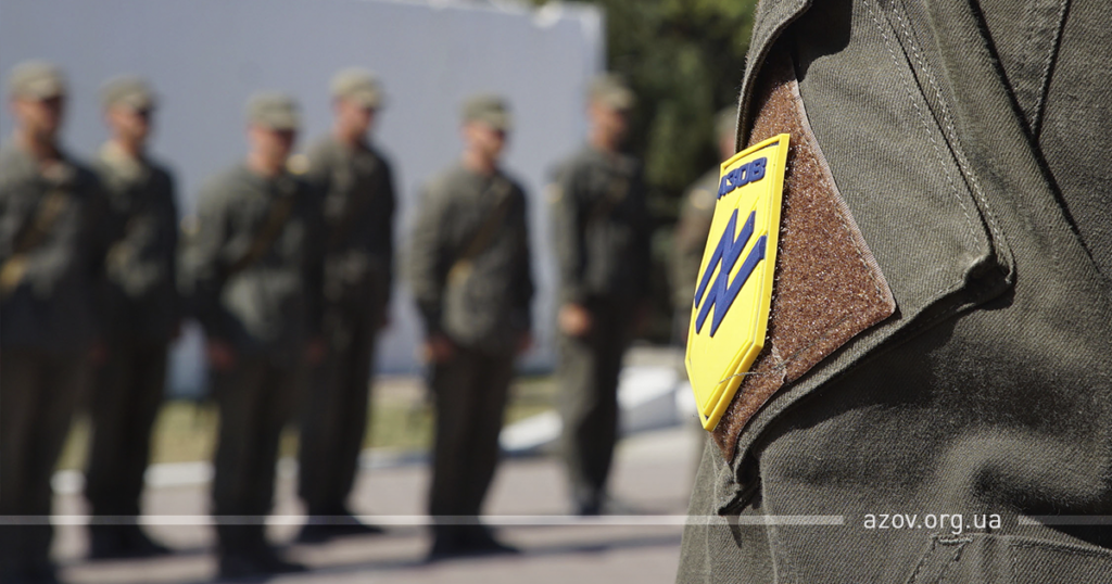 «В історії становлення нашої держави немає жодного століття, коли б наші предки не бились за свою землю. Їхні славні перемоги часто замовчуються нашими ворогами, тому ми повинні відродити бойову славу наших предків. Сильна сучасна українська армія повинна складатись з елітних підрозділів. І полк «Азов» – це, безумовно, один з таких підрозділів. Сьогодні ви отримаєте шеврон полку «Азов». Під цим шевроном загинув не один десяток наших побратимів. Він складає монограму двох літер: «I» – ідею та «N» – націю. Ідею боротьби за свою землю та націю, яка становлюється під час боротьби. Шеврон нахилений вбік, що означає атакувальну сторону. Ми – підрозділ, який завжди йде вперед, і ви тепер маєте честь носити цей шеврон. Наша битва, як і наша перемога, ще попереду. Отож розвивайтесь та вдосконалюйтесь. Слава нації!»