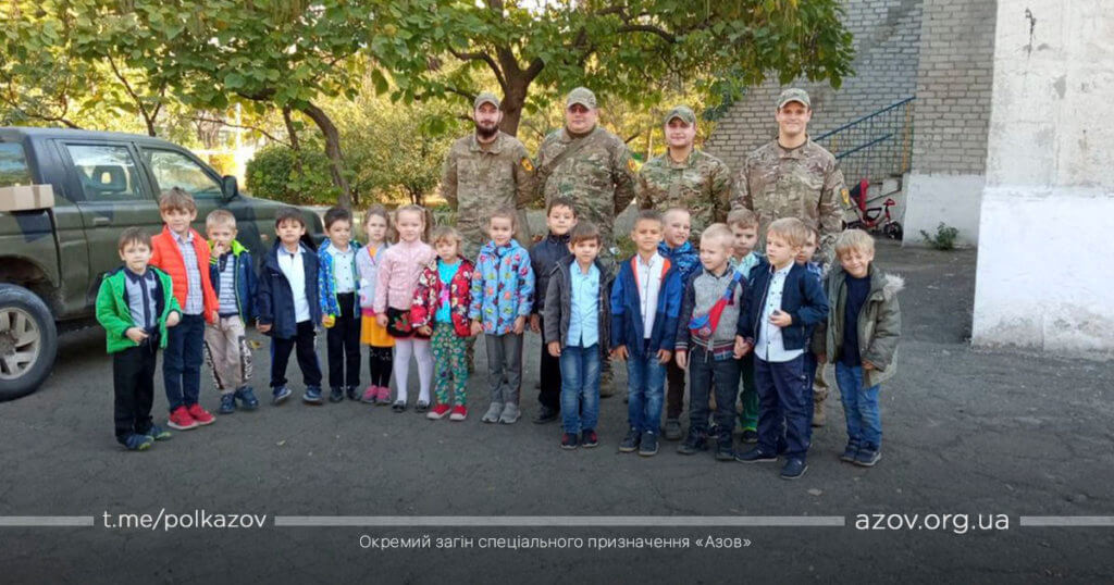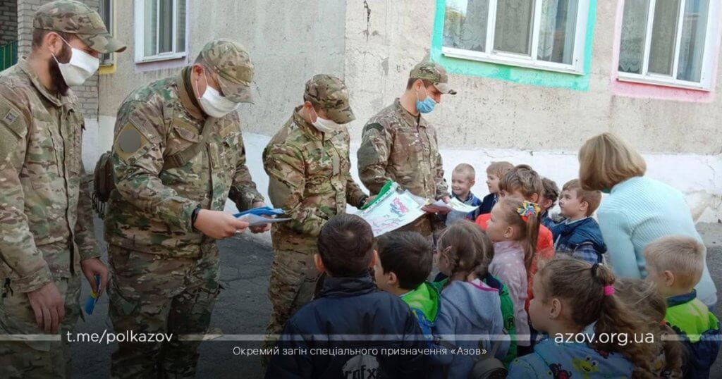 На честь Дня захисника України адміністрація та вихованці дитячого садка №47 Маріуполя запросили в гості бійців полку «Азов», аби особисто привітати їх зі святом. В гостях у дітлахів на азовців з 1-го батальйону чекали десятки усних привітань, віршів та малюнків, які дошкільнята підготували саме для героїв-захисників. Візит не обійшовся без цікавості малих до солдатської буденності бійців, і азовці з радістю відповіли на всі їхні запитання.