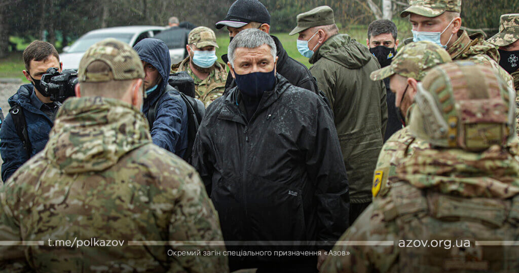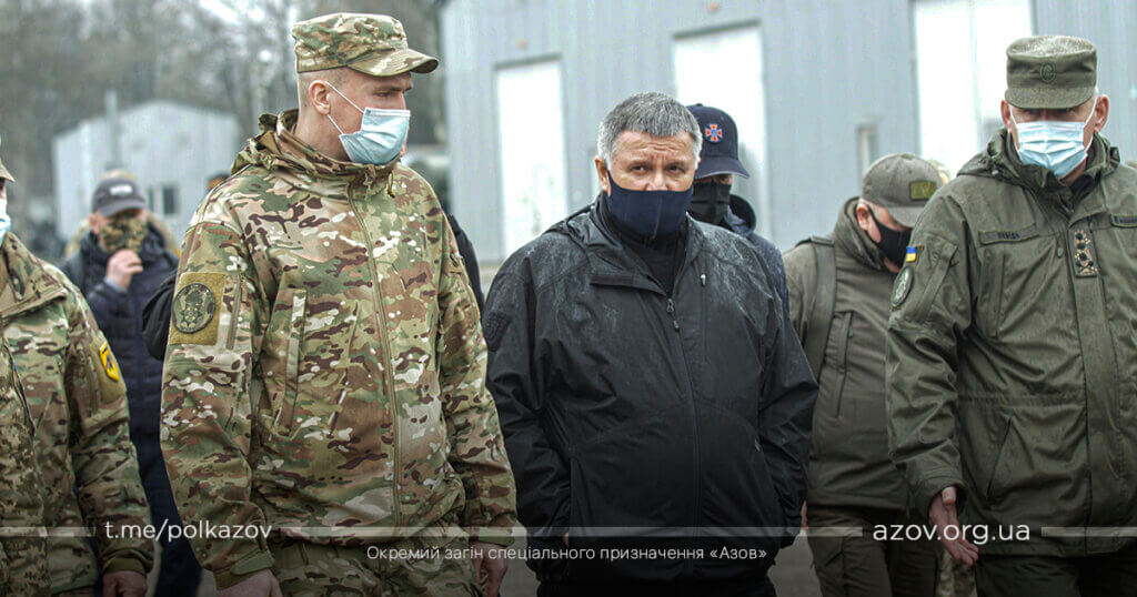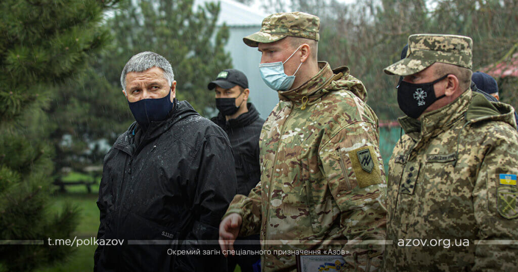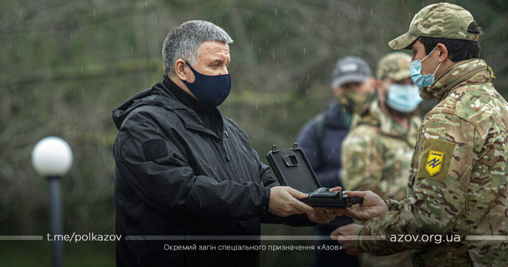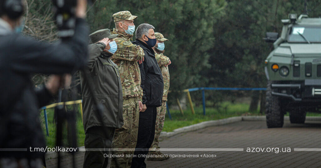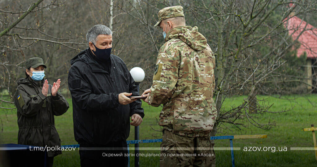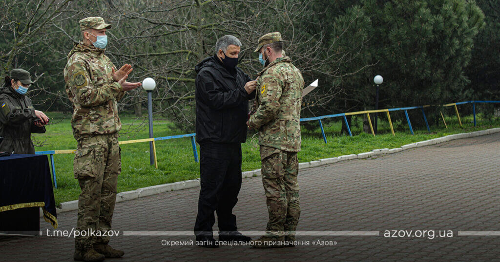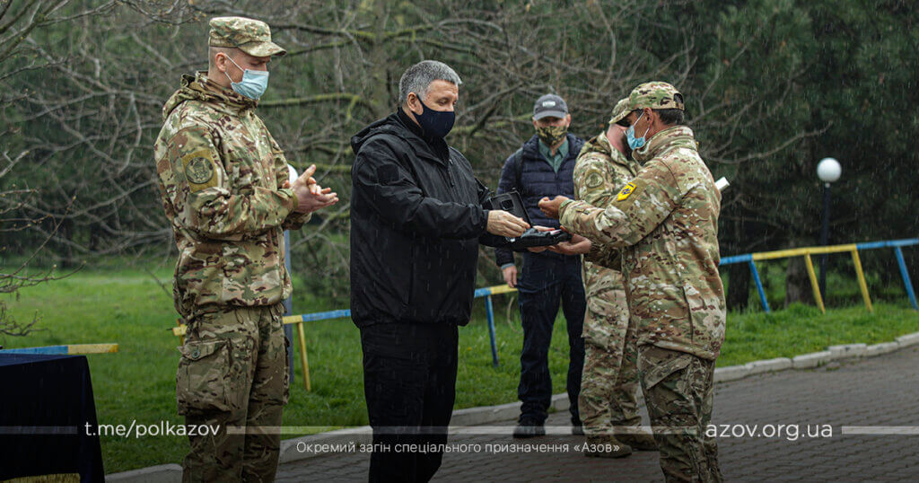 У рамках зустрічі командир «Азову» капітан Денис Прокопенко (друг Редіс) здійснив доповідь, під час якої окреслив основні напрямки службово-бойової діяльності підрозділу. За особисту мужність, виявлену у захисті державного суверенітету і територіальної цілісності України, зразкове виконання військового обов’язку, високий професіоналізм Арсен Аваков вручив азовцям почесні нагороди – медалі «За військову службу Україні» та вогнепальну зброю. Також командиру ОЗСП «Азов» капітану Денису Прокопенку було вручено сертифікат на дві одиниці спеціалізованих бронеавтомобілів «Новатор».