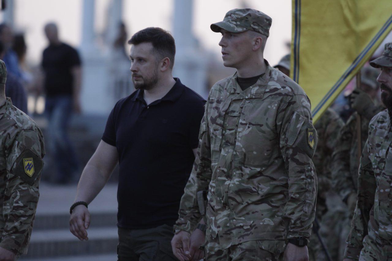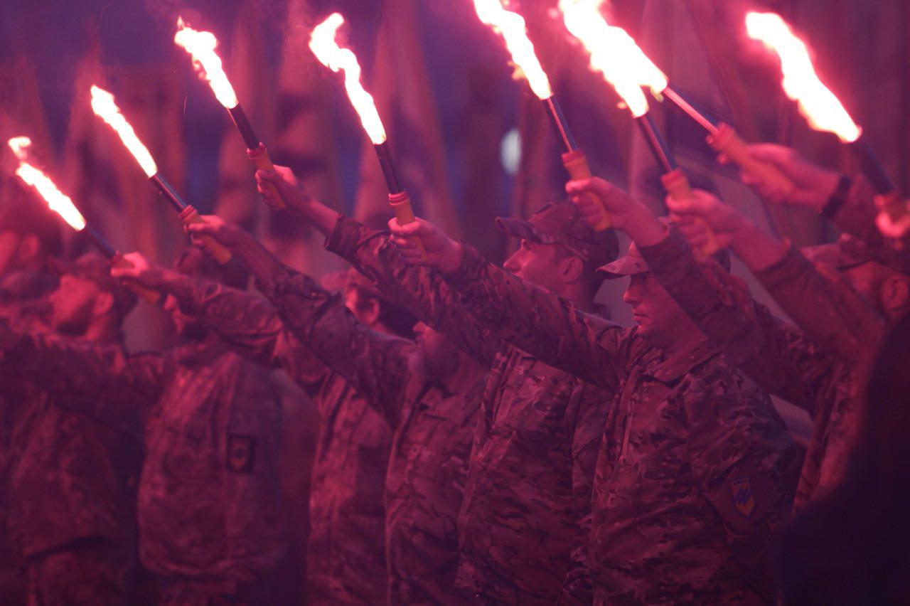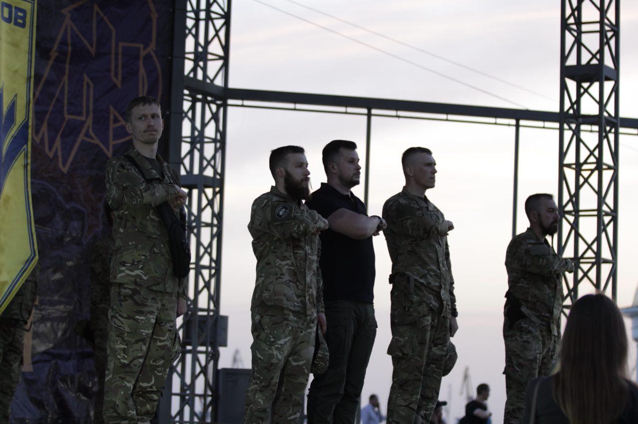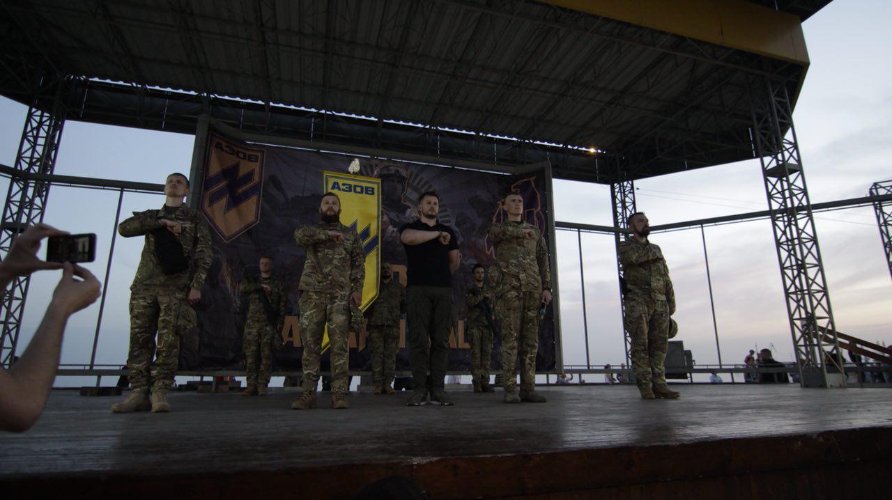 Першим слово мав командир полку АЗОВ Редіс: «Сьогодні ми відзначаємо четверту річницю від дня створення АЗОВу. Тоді 56 добровольців взяли до рук зброю та почали свою боротьбу проти російського окупанта. Через декілька місяців ми зросли до батальйону, згодом переформатувалися у полк. Сьогодні переді мною стоїть професійний підрозділ, до складу якого входить більше тисячі бійців. За чотири роки боротьби АЗОВ втратив 36 бійців. Вони полягли за ідею, за незалежність своєї країни».