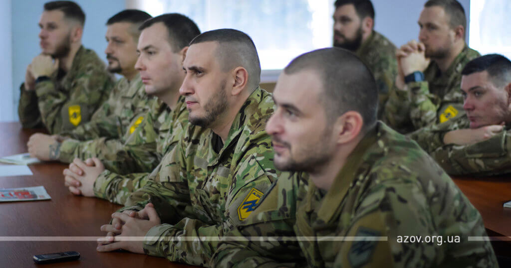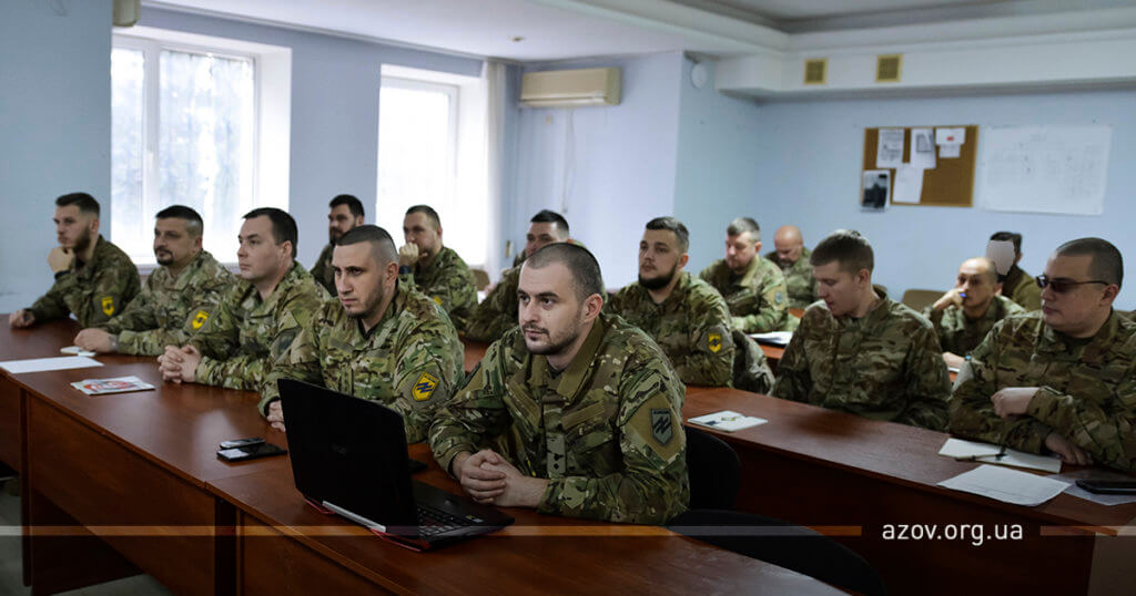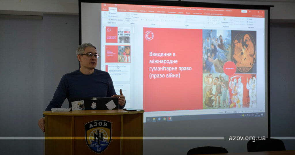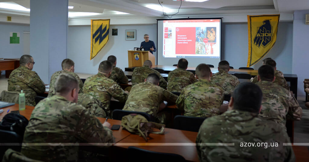 29 січня на гарнізоні полку «Азов» відбулася лекція з основ Міжнародного гуманітарного права для заступників командирів з роботи із особовим складом. Прочитав її представник міжнародної гуманітарної організації «Женевський заклик» Артем Конопкін.