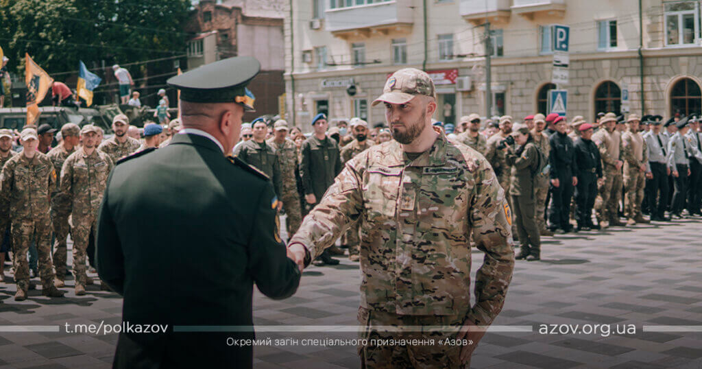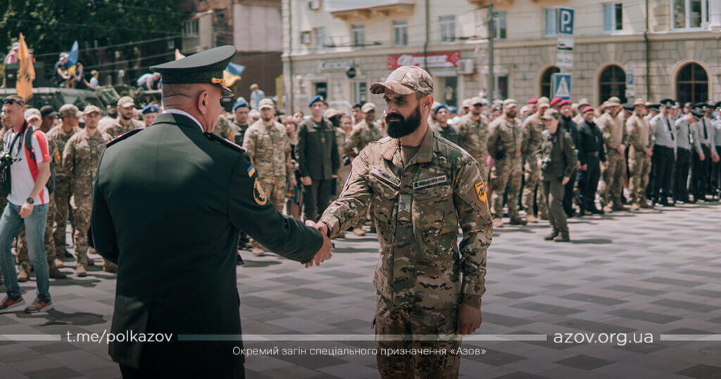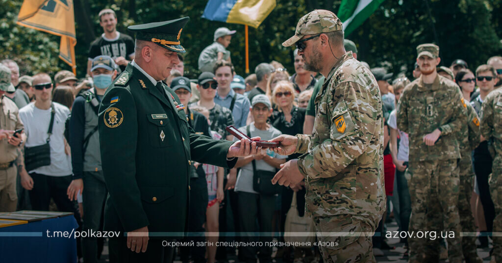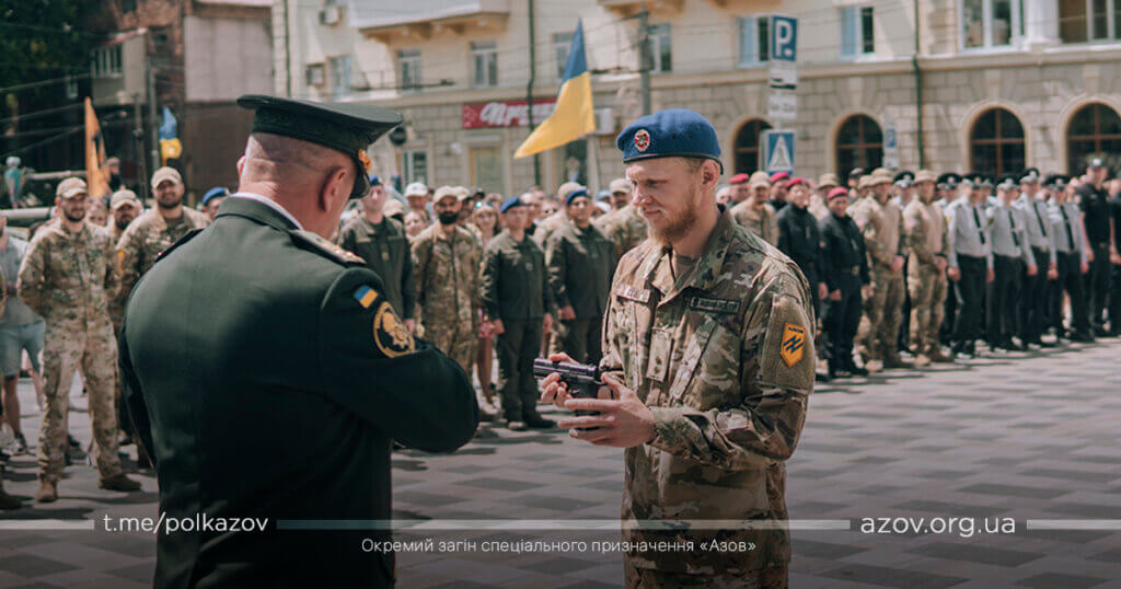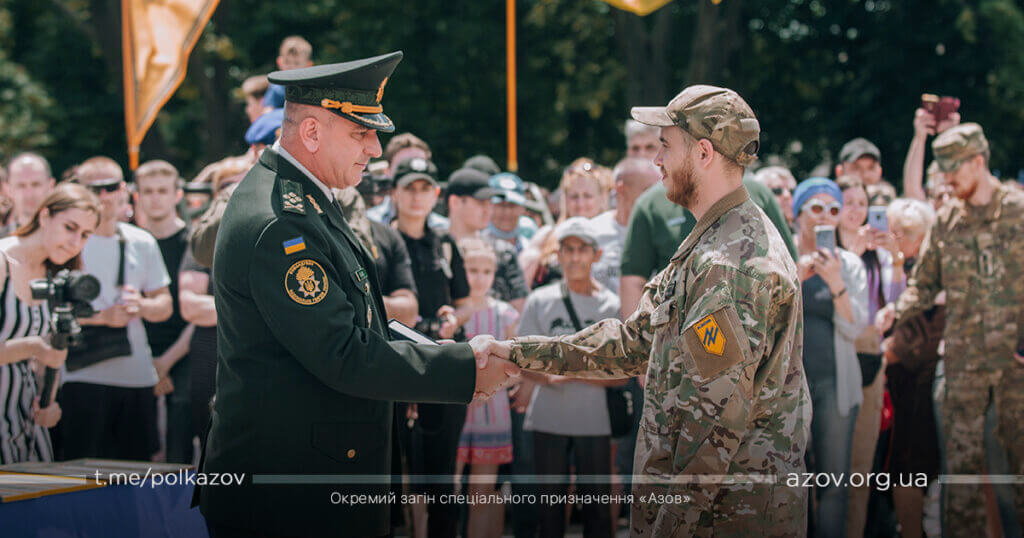 По закінченню урочистих промов бійці полку «Азов» отримали з рук командувача Національної гвардії України відомчі нагороди НГУ, МВС та нагородну зброю.